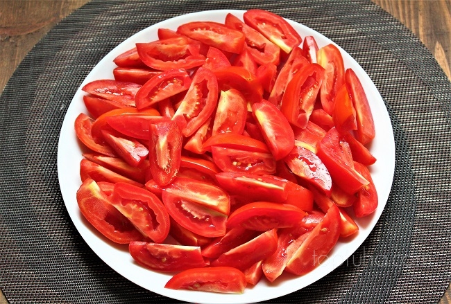 Сразу начинаю обжаривать. Помидоры пробиваю в комбайне.
