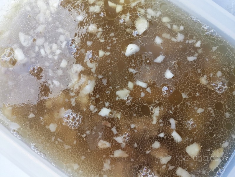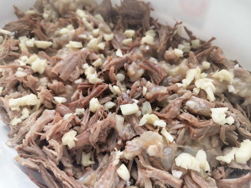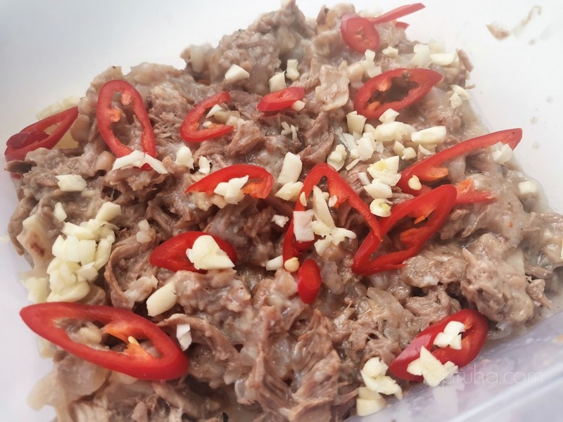 Мясо в этот раз разбирала и руками на волокна, некоторое порубала ножом, а «субстанцию» с костей однозначно измельчила тем же ножом. Пропорционально разместила в пластиковые, пригодные для горячего, ёмкости. Чеснок давлю ножом, потом рубаю. Сразу добавляю сверху мяса где-то 60% его количества. Остаток берегу.