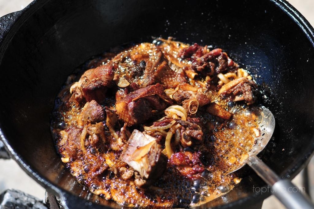 В казане разогреваем до дымка около 50 гр. темного льняного масла узбекского розлива, которое прям на бутылке названо "ЗИГИР", смешанного со 150 гр. хлопкового, так же узбекского розливу. Обжариваем в нем утиные кусочки с потрохами. Льняное масло имеет почти черный цвет и оттого рис будет темноватый. Масло на плов следует брать плотное, оно лучше держит температуру. У кого нет льняного или хлопкового может использовать конопляное. Както шутники конопляного не нашли, но с собой у них было и просто посыпали все, что притащили на морковь. Потом все веселились и думали чтож это за зира такая? Я конечно осуждаю, но такой кулинарный прием встречается.