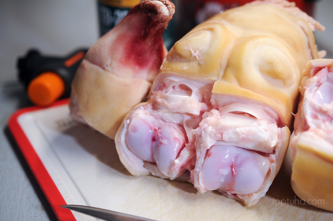 Мясник предложил разрубить — но нуегонахуй! Осколков не оберешься. Ближний сустав гибкий и легко открывается. Надо сначала сделать разрез между копыт и попасть лезвием в суставную сумку. Там еще есть второй, ближе к трубчатой кости, но он жестче, и мне хватило разреза по первому