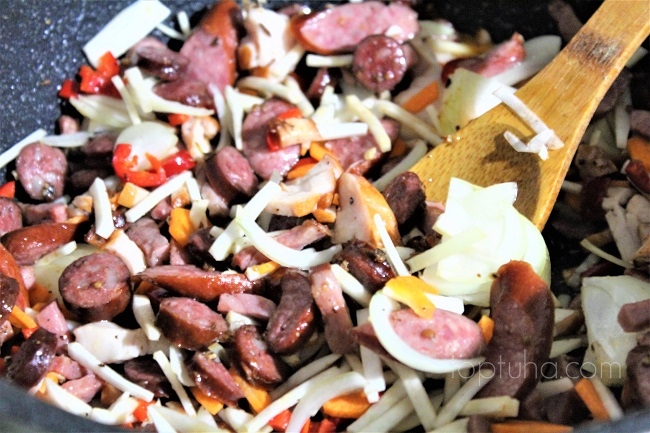Первым делом обжариваю специи, потом колбаски, потом нарезанное овощное.