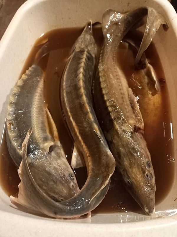 Мои осетры в среднем весят по 1 кг. Маринуем 48 часов. По сути - это уже готовый продукт. Солёная рыба, не сырая. Можно кушать. Не отравишься)))