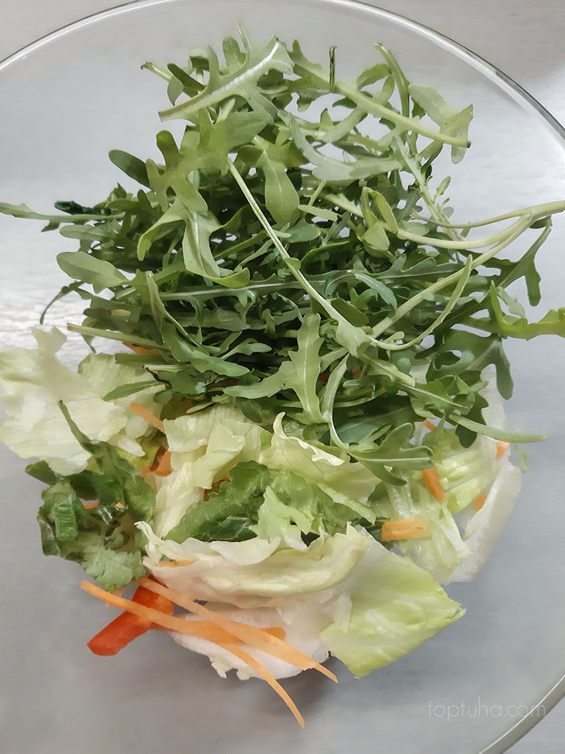 Взял руколу и всякие салатные листики с морковкой и болгарским перчиком. Немного присолил и добавил острого и сладкого чили соуса