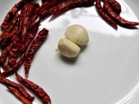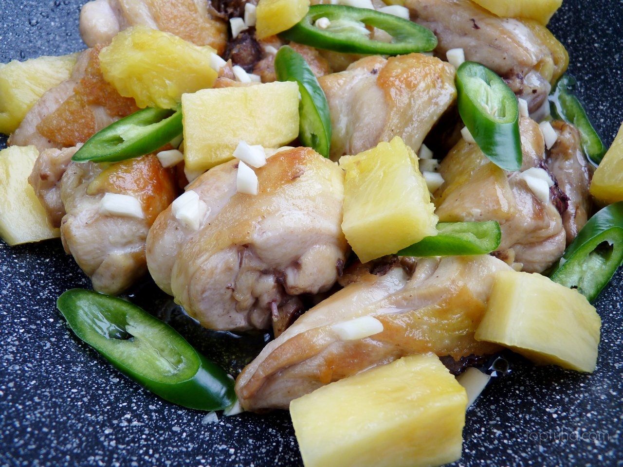Как только она обжарится, добавляю к ней чили перец, чеснок, ананас и быстро обжариваю