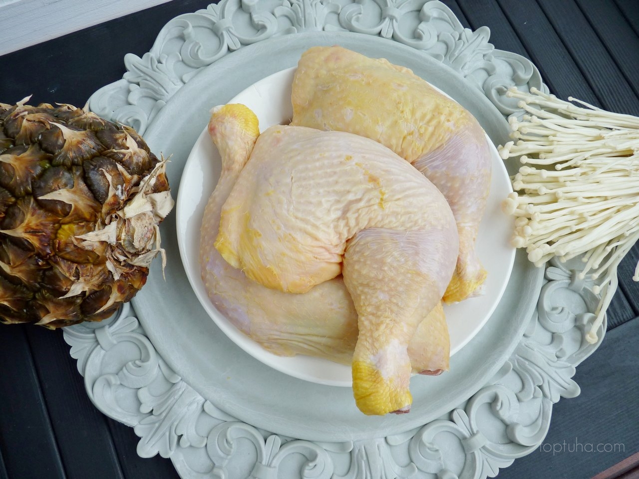 Ингредиенты простые – курица (взяла бёдра), ананас, эноки