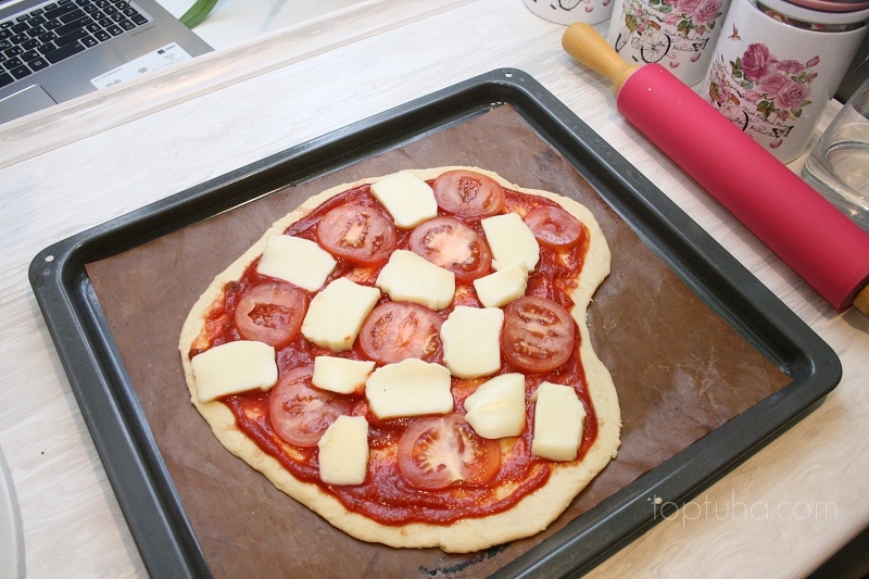 Сверху смазываем соусом, режем помидор (можно обычные, а можно и черри располовинить) и пластами сыр (а его можно и потереть):