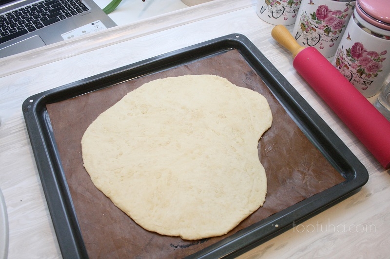 Тесто отдохнуло (увеличивается немного и приобретает некую ноздреватость). Раскатываем его. Стараемся в круг, но если не очень получилось, то не страшно:
