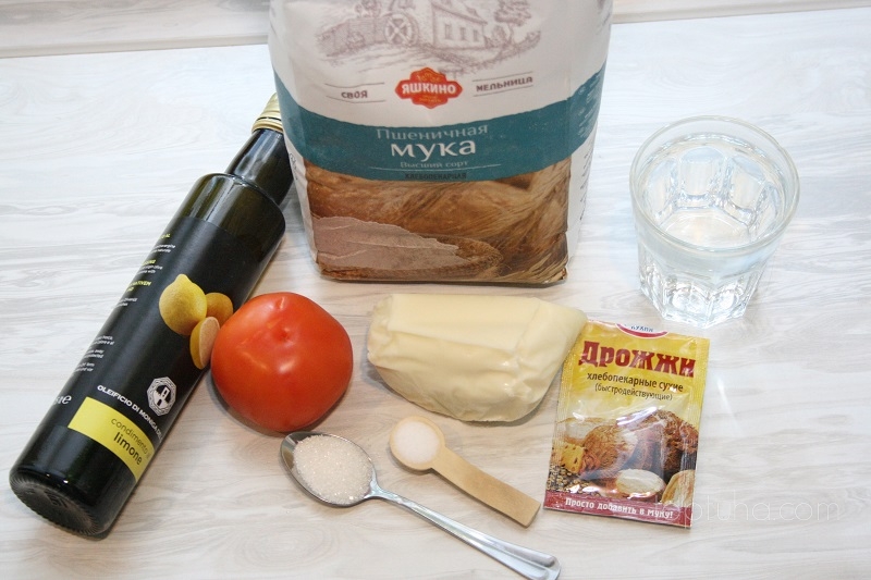 Итак, нам надо всего ничего: полчайной ложки сухих дрожжей, чайная ложка сахара, 180 мл тёплой воды, 280 гр. муки, 30 мл. оливкового масла, моцарела для пиццы, помидоры, базилик (увы, на фотосессию не явился).