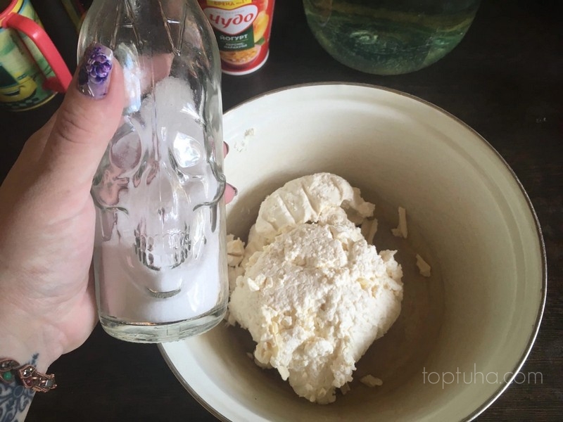 Отжатую творожную массу разбавляем солью, тмином и перцем по желанию, вымешиваем.