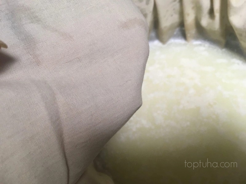 Выливаем нашу массу в получившуюся конструкцию и оставляем стекать. Когда основная масса жидкости останется в миске концы наволочки связываем и подъвешиваем узелок за ручку окна например