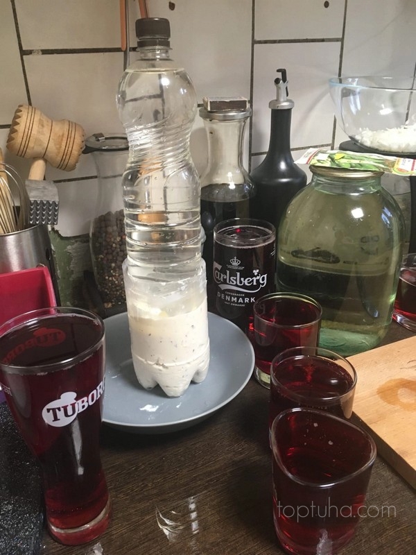 Для гнёта я хотела использовать бутылку из-под мартини, оперативно разлила его по стаканам и поняла что это была плохая идея. Во-первых: столько мартини я в жись не выпью, а во-вторых: диаметр бутылки не подошёл. Поэтому мартини вернулось домой, а у мужа была конфискована и разлита по тем же стаканам бутылка пива