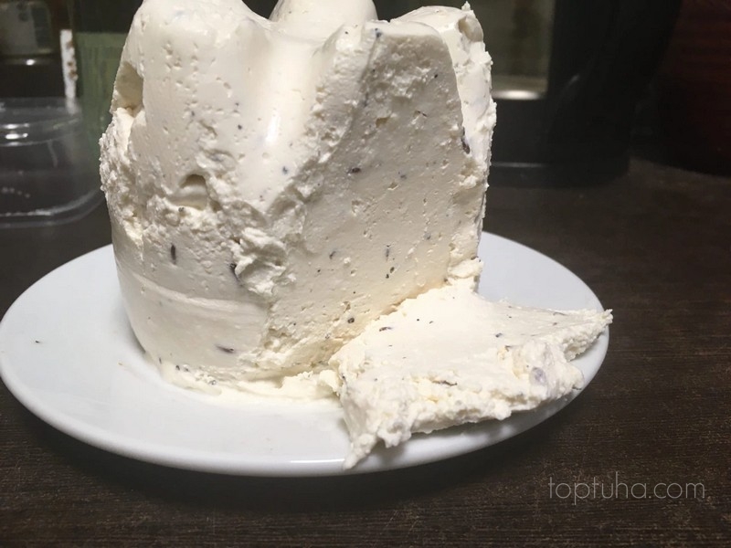 Оставлена эта башня была на ночь и утро, потом я убрала гнёт и убрала до вечера в холодильник. На выходе получила такой кислый творожный сыр