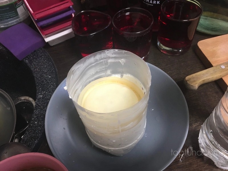 Ставим под гнёт. Чёт у меня вся подходящая посуда закончилась и я решила приспособить под это дело обрезанную бутылку из-под разливного кваса. Сверху обычную пластиковую (она же «капроновая») крышку