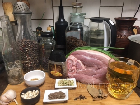 А дальше по факту надо добавить пряные овощи и зелень чтобы мясо было ароматным. Можно обойтись без изъёбств и добавить в бульон стандартные лук, морковь и лаврушку. Но стандарты - не для меня! Как говорится: была бы задница, а уж приключения на неё всегда найдутся. Поэтому я оторвалась по полной: лавр, можжевеловые ягоды, гвоздика, тмин, стебель и корень сельдерея сухие, чеснок, зерна горчицы, соль, перец горошком и молотый, зелень лука.