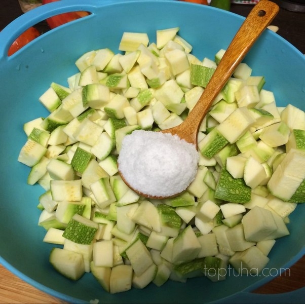 А дальше вообще просто: кабачки кубичим, солим и перемешиваем, чтобы они дали сок