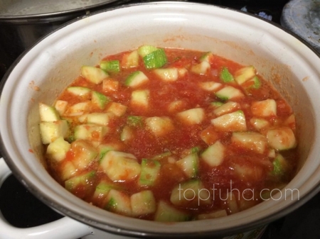 Как закипит закидываем кабачки, помидоры, чеснок, две чашки воды, острый перчик и лук