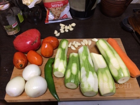 По всем углам кабачки, под столом кабачки, на подоконнике пара штук примостилась. Жаль низя ими ипотеку платить. Надо срочно переработать хотя бы часть. А тут соседка как раз поделилась рецептом остреньких кабачков на зиму в банках. Всё что я взяла уместилось на разделочной доске