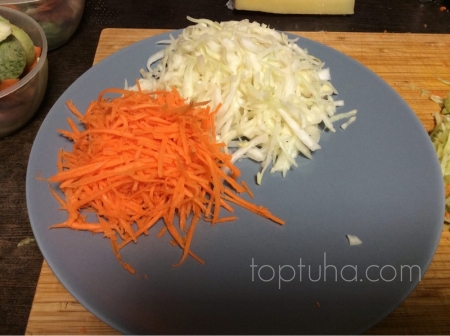 Из указанного количества получается примерно 8 порций салата, так что на четверых мы взяли половину индигриентов, а вторую сразу складывали в контейнер про запас