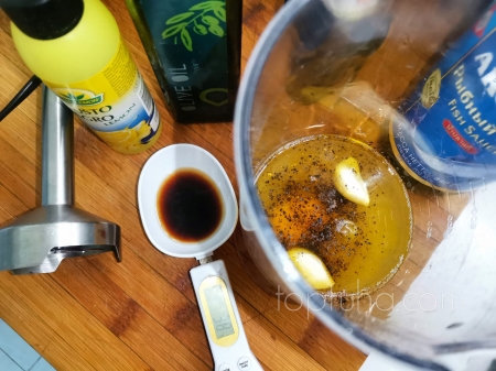 Яйцо, чеснок, рыбный соус, аквафабу, соевый соус, лимонный сок, оливкосое масло..