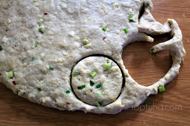 Греем духовку до 200. Прямо руками, без скалок всяких, делаю блин где-то 1,5 см толщиной.