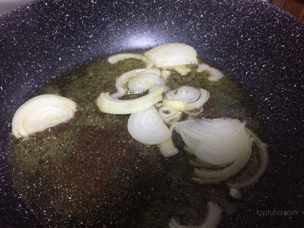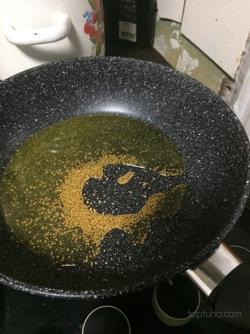 И пока пока она трещит на сковородке режим и чистим лук.Как только горчица « оттрещалась» закидываем лук