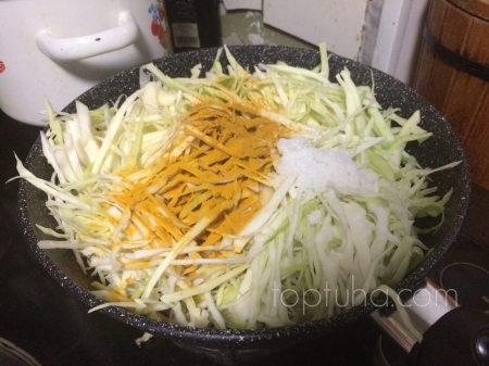 Капуста должна остаться хрустящей, но при этом быть мягкой. Капуста альденте. Делаем ямку и всыпаем три ст. л. несладкой кокосовой стружки,