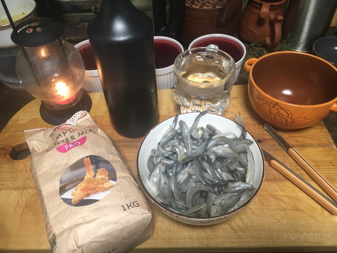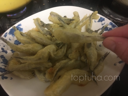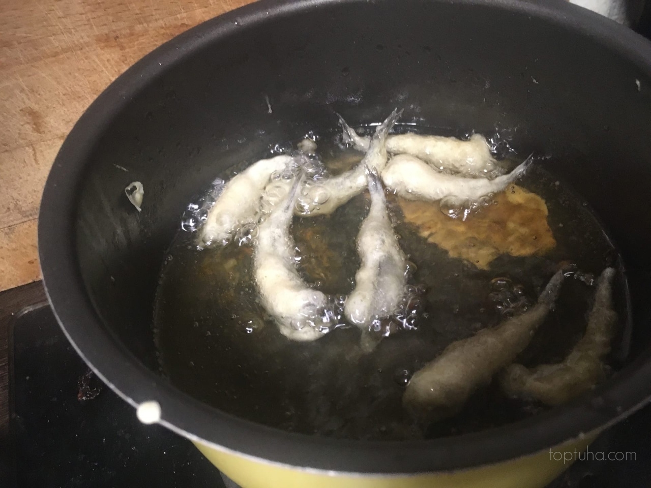 Корюшку я специально покупаю самую мелкую, какую найду. Плюс -готовится почти мгновенно. Минус - помыть и казнить её методом отсечения головы, монотонная работа. За головой вытягиваются внутренности, икра и молоки остаются внутри. Беру за хвостик, обмакиваю в темпуру,