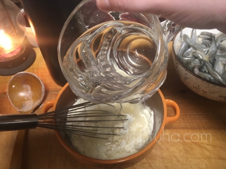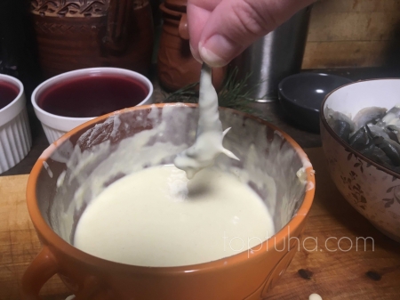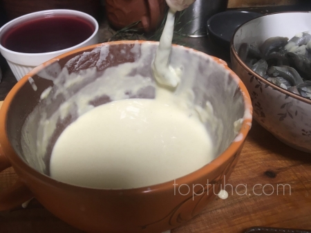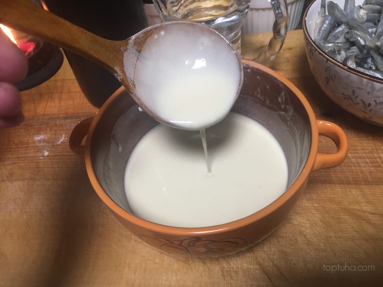От густоты этой "сметаны" будет зависеть "прозрачность" темпуры. Мне нравится не слишком плотный слой и я делаю смесь по консистенции жидкой сметаны.