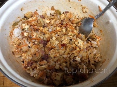По баллам данное крео получает 10 из 10 за то, что отсутствие мяса вообще никак не ачучаецца. Блюдо сытное и ароматное. Немножко остринки и кислинки, всё как я люблю. И как ни странно получилось весьма сочно. Так что однозначный мой рекомендосьён. Оказываецца есть жись без мясы