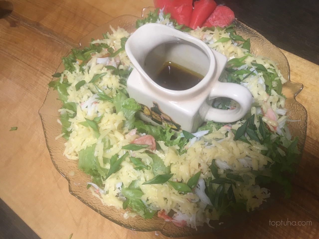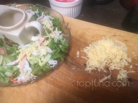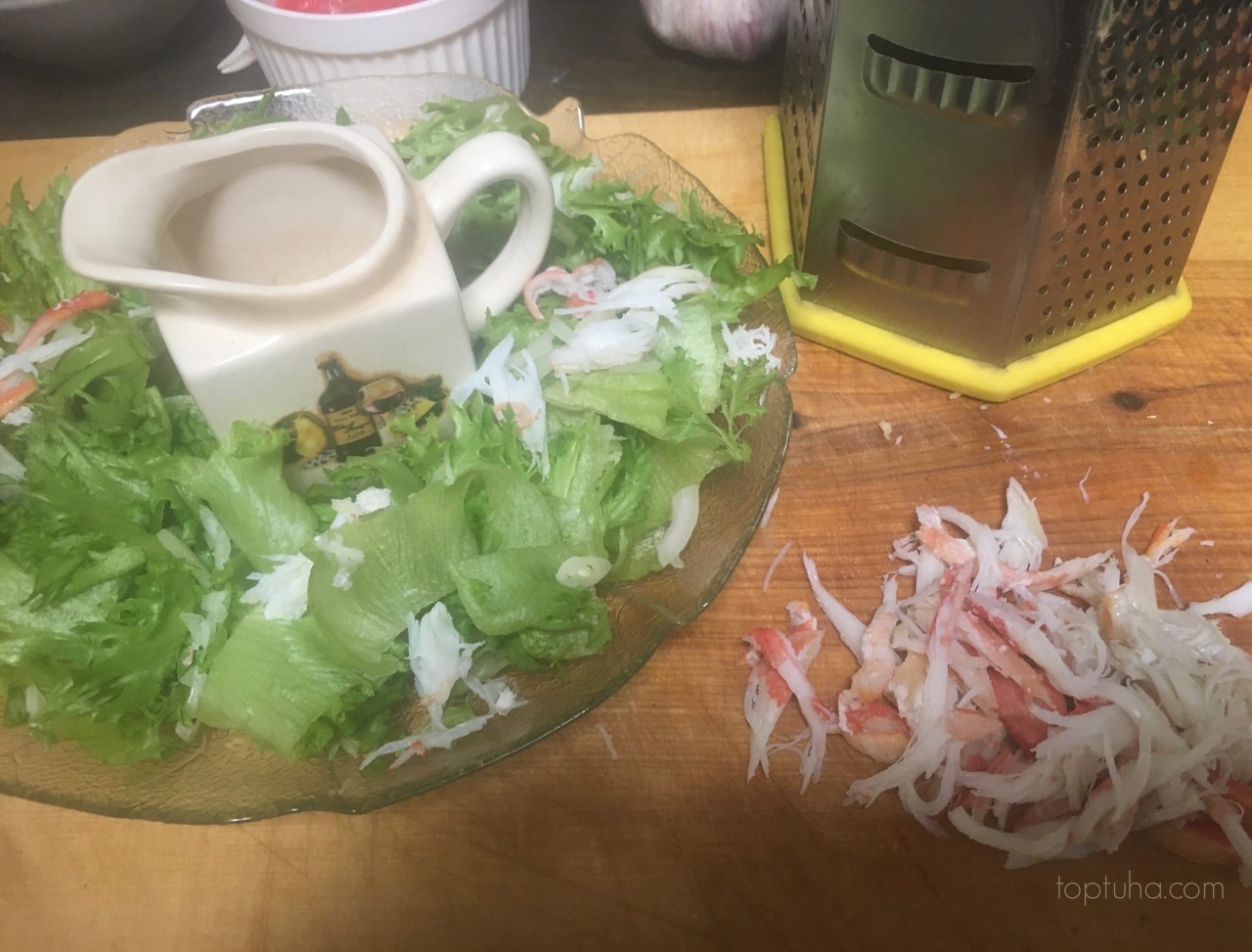 Крабовое мясо разбираем на волокна и распределяем по салату.