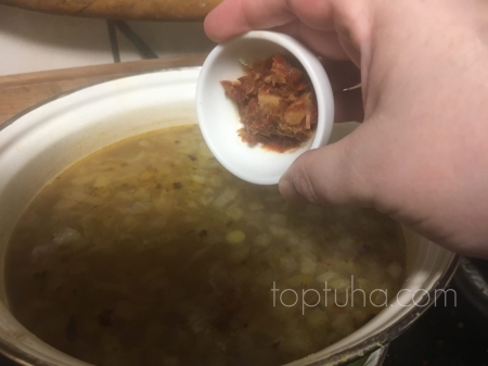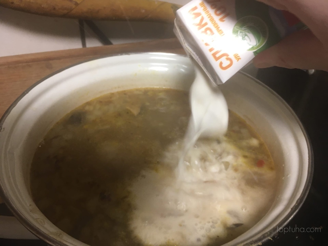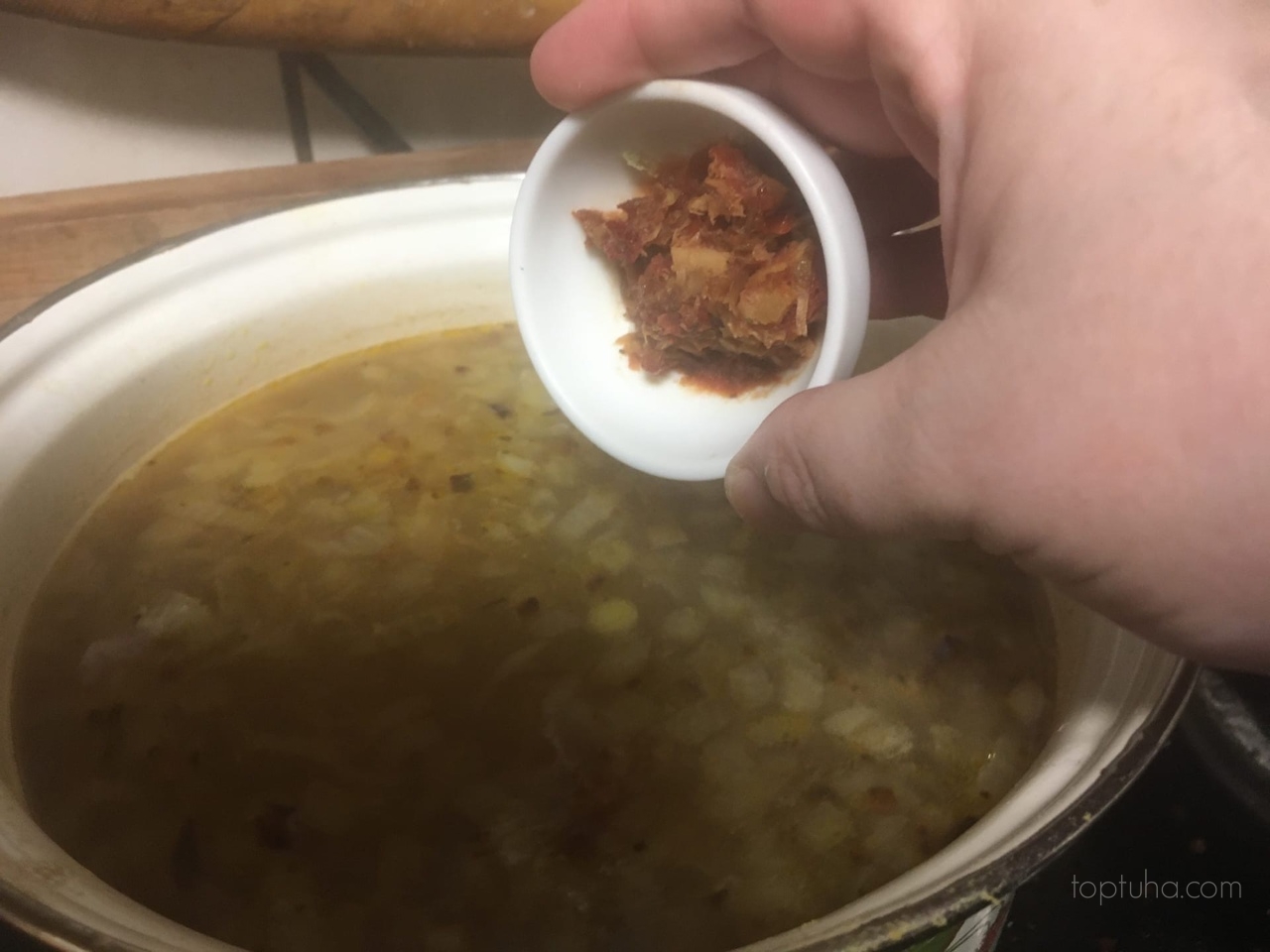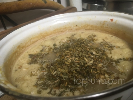 Да-да, мне просто было неохота пачкать руки, сознаюсь. Они тут не только для сытости, но и для заполнения пространства. Для того же самого возвращаем в суп размятый картофель. Варим пока текстура супа не станет такой кремообразной, однородной что ли. Как только все индигриенты подружились закидываем зелень,
