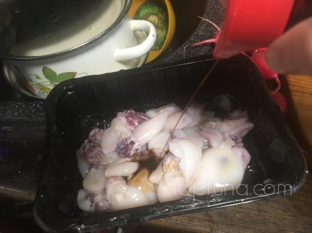 Хватит пердеть под одеялком, марш на кухню! Каракатиц промываем и прямо в упаковке маринуем в соевом соусе.