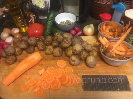 Пока варится- жарится строгаем овощной салат, добьём организм витаминами так сказать.