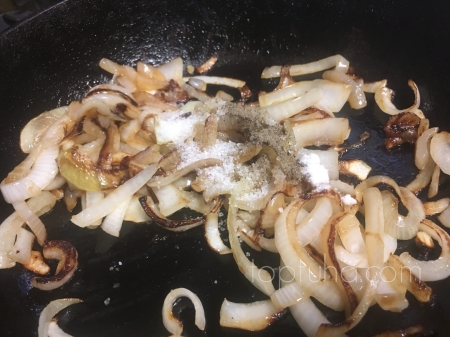 Лук режем четвертькольцами и обжариваем, добавив в самом конце любимые приправы.
