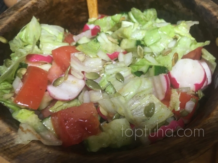 - и огурцы, помидор, редис, лук, тыквенные семушки + ароматное масло для салата (но это ваще не обязательно)