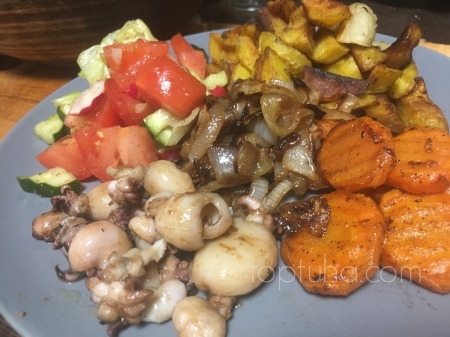 На сковороде гриль разогрела пару бульков масла, и обжарила с каждой стороны буквально по минуте-другой, зависит от размера каракатиц. И всё. Осталось собрать всё на тарелке и попробовать.