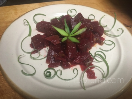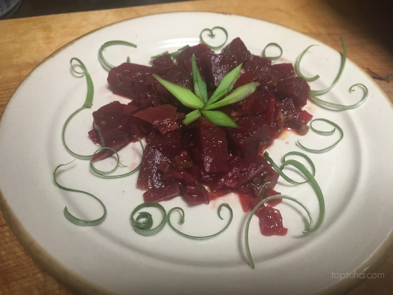Берём средневековую кастрюлю и отвариваем в ней свеклу. Как сварилась, режем крупными кубиками.