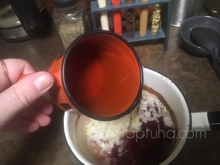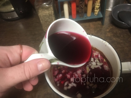 Нарезанные овощи складываем в сотейник, заливаем вином. Или пивом.