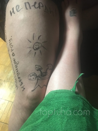 А еще мне после душа было скучно и я задумалась а чёй-то у мну есть татуировки на везде, я у домашнего мужа нет? ну и разрисовала ему ногу. гы!
