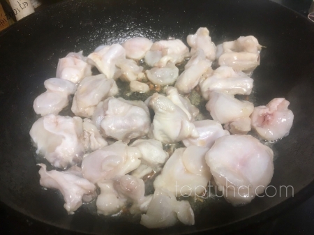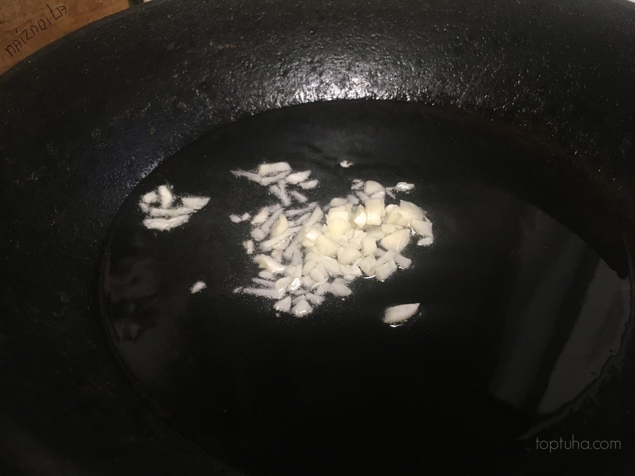 Чеснок измельчаем и закидываем в сковороду с 2-3 ст. л. растительного масла.