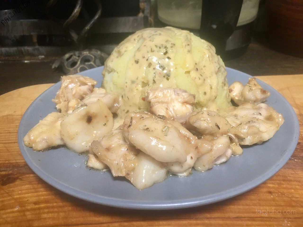 Если у вас маленькая сковорода или много языков, то лучше готовить в два акта. Готовятся они очень быстро, поэтому не забываем помешивать. На миску ставим дуршлаг и высыпаем готовые тресковые языки. Ждём пока стечёт весь сок, ведь он основа нашего соуса! Жир и масло находятся в расслоенном состоянии, а нам надо их смешать. Некоторые повара для этого ещё на стадии обжарки крутят сковороду вокруг своей оси. Я же просто добавив соль, перец и тимьян