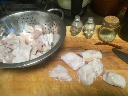 Блюдо готовится очень просто и быстро. Языки трески нарезаем на одинаковые кусочки.
