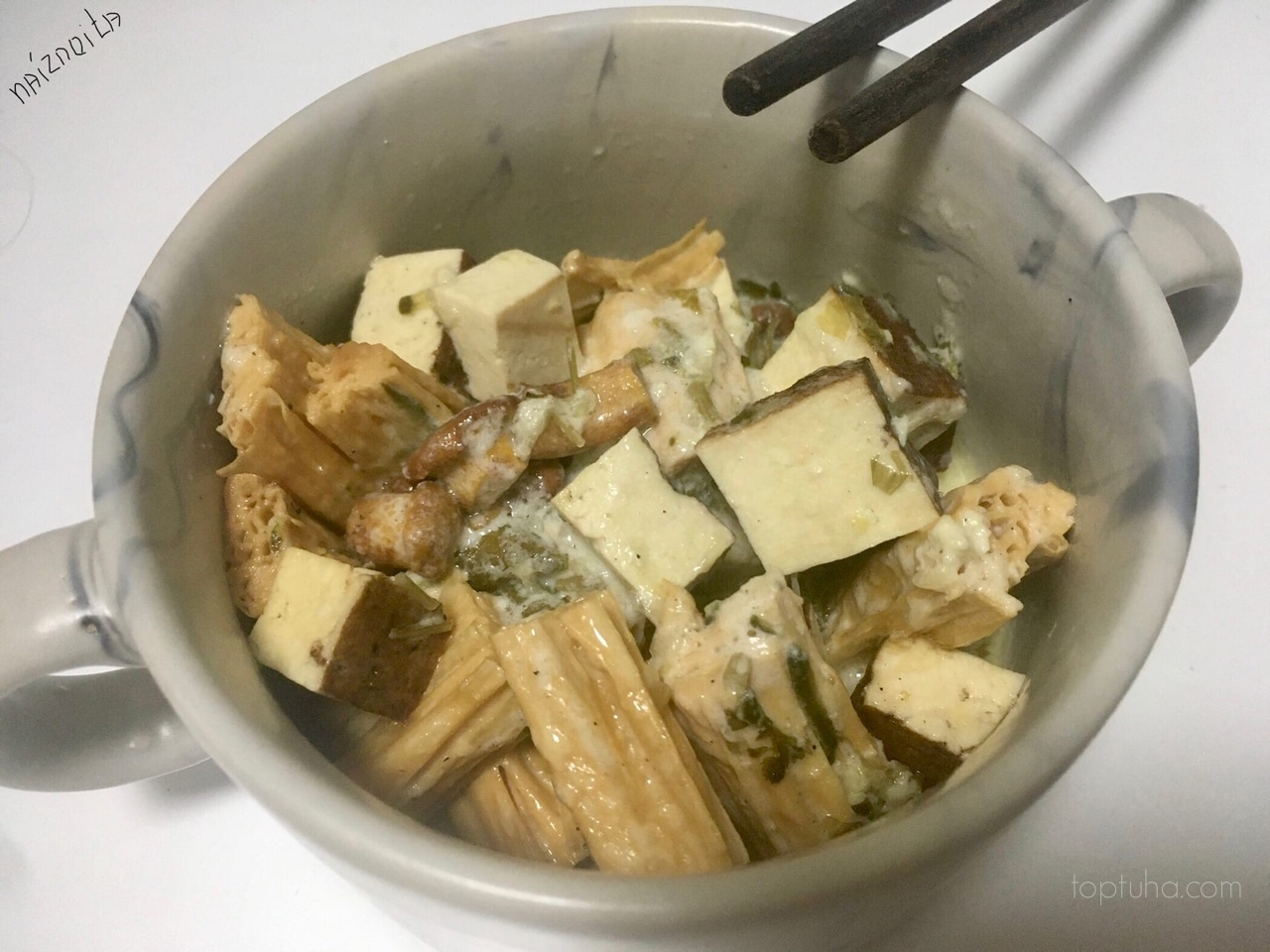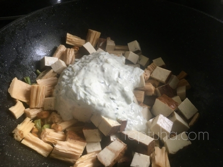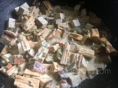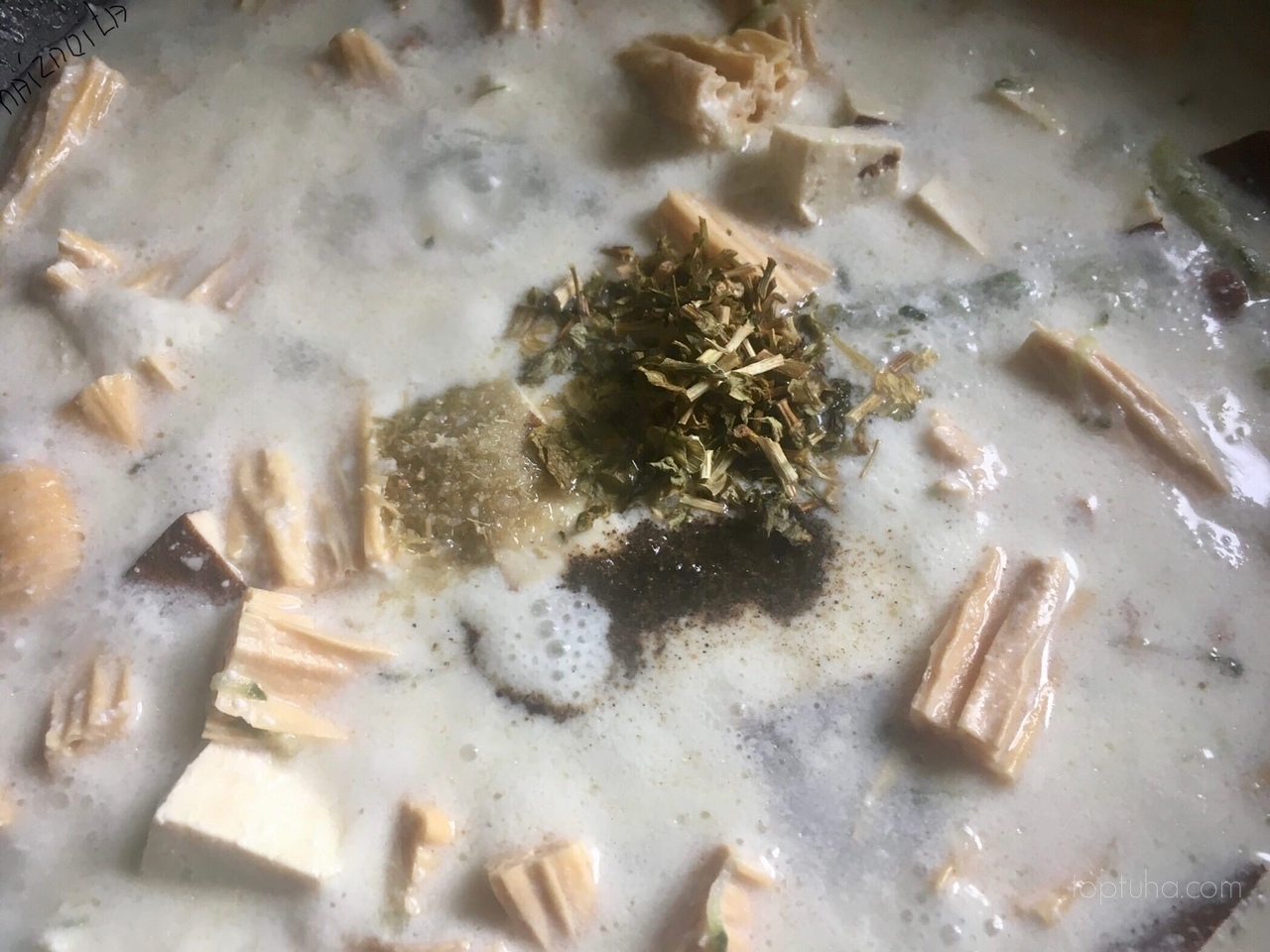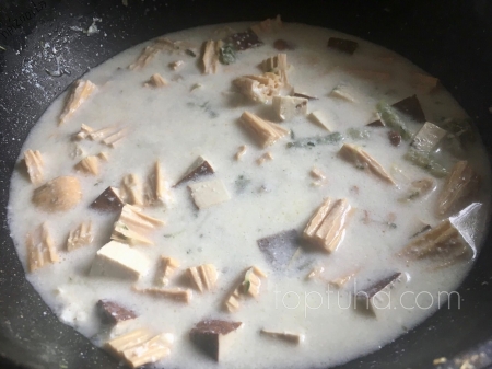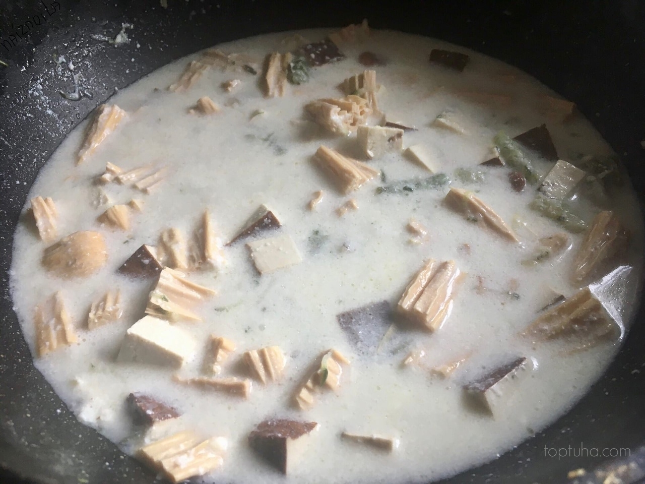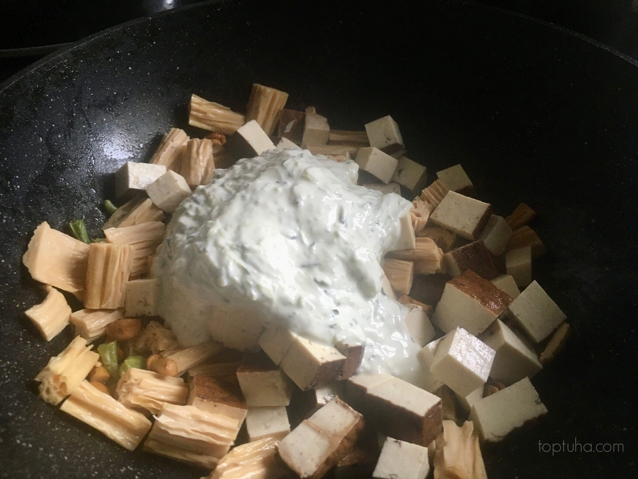 По индигриентам: если бы не необходимость утилизировать сметанный соус я бы взяла кокосовое молоко для полного погружения в вегетарианство. Так что отступать от рецепта не возбраняется. Тофу лучше брать не копчённый, а обычный. У копчённого не слишком подходящий для этого блюда аромат. У меня просто не было другого. Соевая спаржа - это высушенная пенка с соевого молока и с зелёным растением в родстве не состоит. Поэтому особого вкуса не имеет и требует предварительного замачивания в холодной воде. Фасоль у мну своя, подоконничная, поэтому никаких танцев с бубнами я с ней не делала. Как и с грибами. Их я собрала в экологически благонадёжном месте возле кладбища.