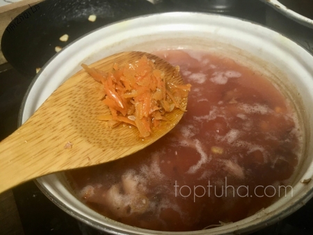 хорошо размешиваем и вливаем в суп. Добавляем поломанную фунчозу