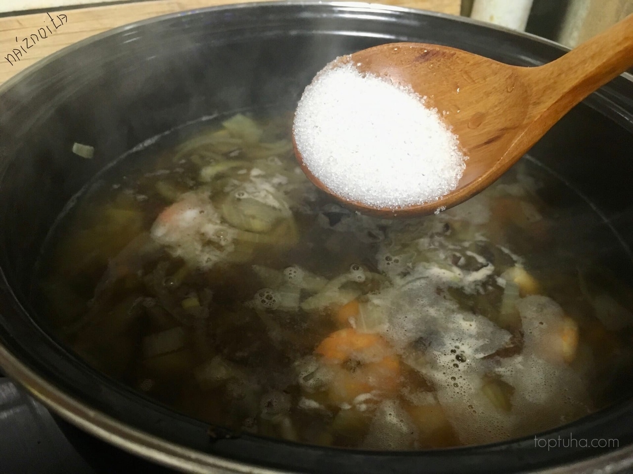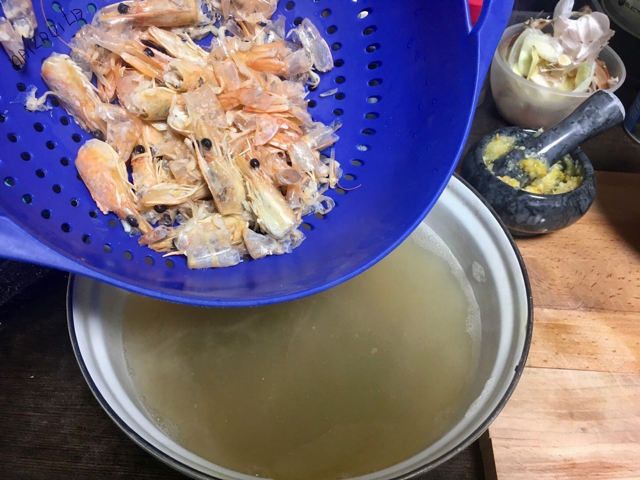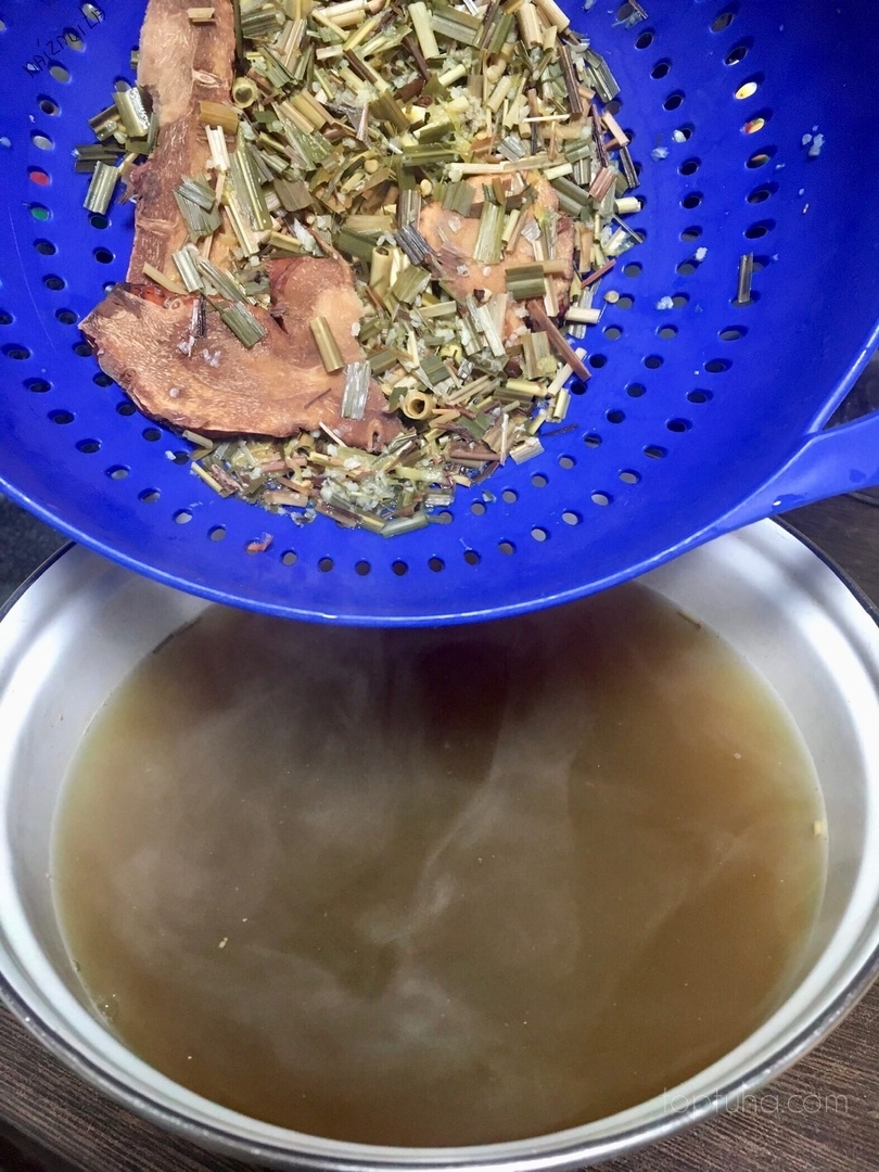 Спросите почему я не варю панцири и приправы вместе, ведь всё равно процеживать? Да потому что лемонграсс и галангал я промываю под краном, просушиваю и использую повторно заваривая в чай. Что странно привкуса креветок нет. А вот вкус приправ есть. По крайней мере для чая хватает.