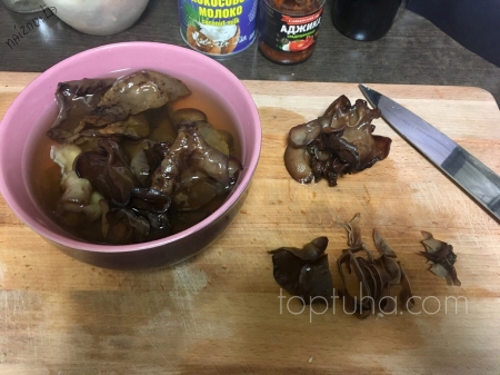 Для том яма и некоторых других аутентичных супов я зажарку не делаю. Как только древесные грибы распустятся, режем их полосками не забывая удалить плодоножку.