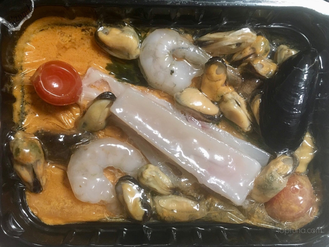 Но для начала с интересом рассмотрела упаковку: пластиковый лоток в котором упакованы в вакууме морепродукты в соусе. Выглядит аппетитно.