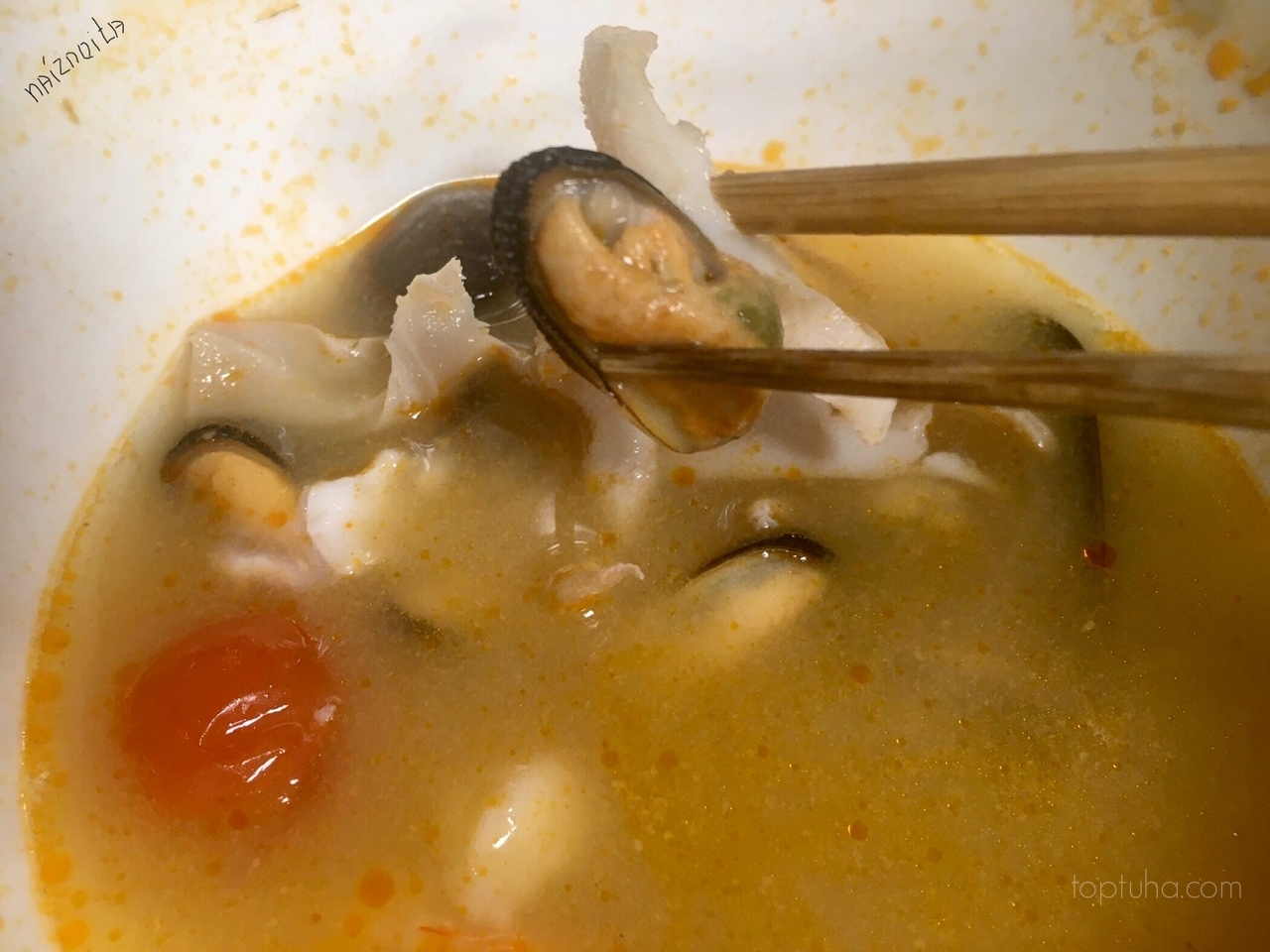 Очень вкусный бульон. В меру острый и ароматный. По фото кажется что твёрдого наполнения маловато. Отнюдь. Это порционное блюдо. А для одного человека морепродуктов более чем достаточно. Я объелась. Очень вкусно.