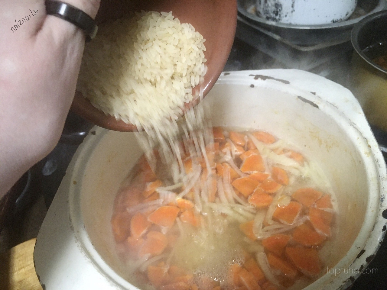 Овощи для ухи я по традиции не обжариваю. Всыпаем рис, доводим до кипения, при необходимости убираем пену.