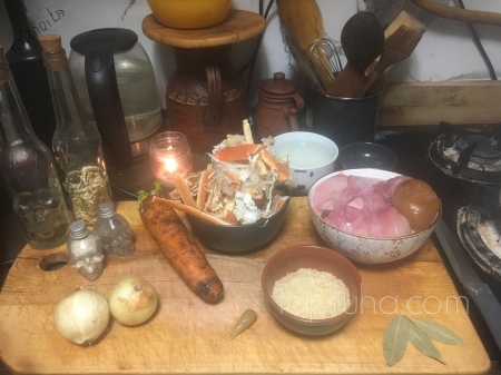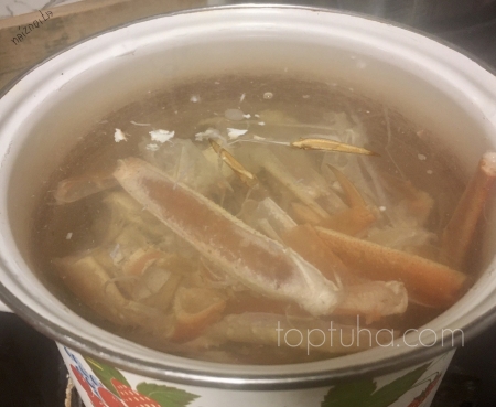Приступаем к хулинарству и первым делом ставим варицца бульон. У меня он из панциря с клешней краба опилио. Оказалось в них содержится куча полезных микроэлементов в том числе хитин. Так что не выкидывайте панцири ракообразных, организму нужнее.